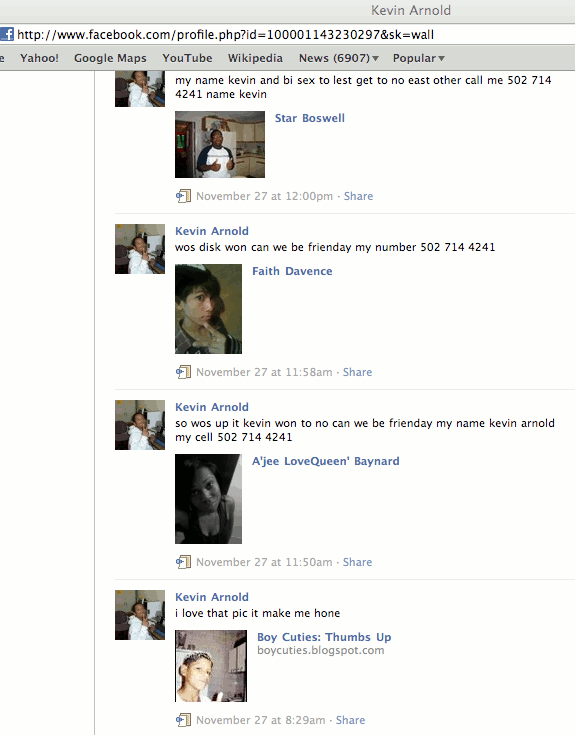 Kevin Arnold is interested in "kids" and a number of other things. I guess that might explain why a number of his friends have pictures of young boys as their profile photos.